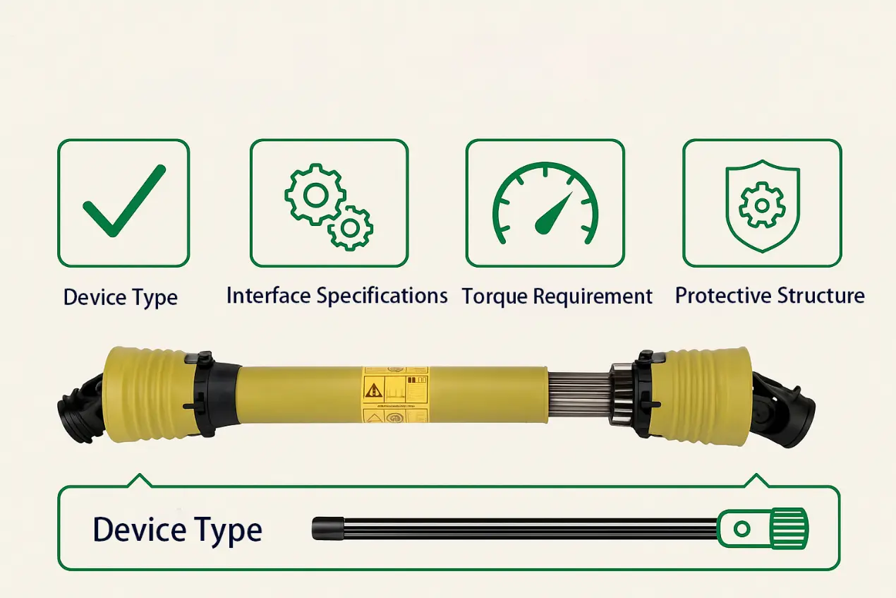 În primul rând, este necesar să se confirme tipul de mașini agricole care trebuie conectat. Echipamente diferite au cerințe diferite pentru structura, lungimea, forma interfeței etc. a arborelui cardanic. De exemplu: mixerele orizontale de alimentare necesită, în general, arbori PTO cu șuruburi de forfecare sau protecție pentru ambreiaj; presele de balotat rotunzi sunt mai potrivite pentru modelele cu articulații universale încrucișate pentru a face față condițiilor de lucru cu schimbări frecvente de unghi; iar pentru echipamente precum împrăștiatoarele de îngrășăminte de tracțiune, trebuie acordată atenție extinderii libere și cursei de retragere a arborelui pentru a se asigura că arborele nu este spart la întoarcerea sau traversarea șanțului.
