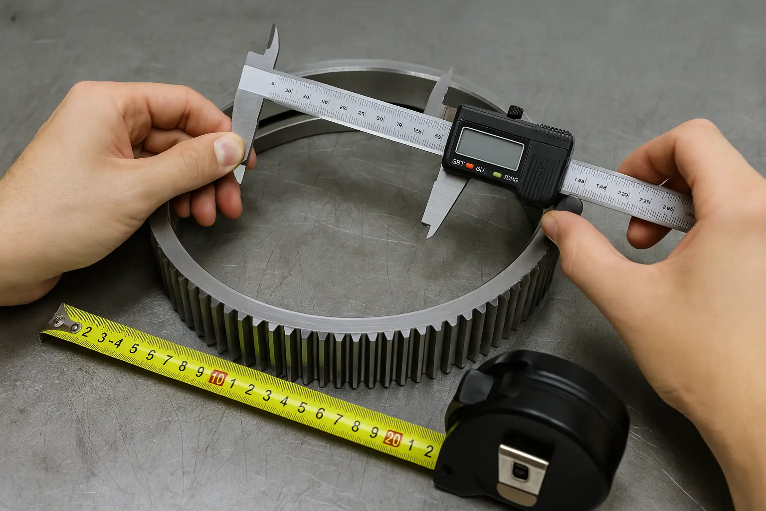 Utilizați un șubler pentru a măsura distanța de la marginea cea mai exterioară a inelului dințat la marginea cea mai exterioară, care este așa-numitul „diametru exterior”. Această valoare determină spațiul ocupat de inelul dințat în structura de ansamblu. Nu poate fi prea mare sau prea mic și trebuie să se potrivească cu poziția echipamentului original.